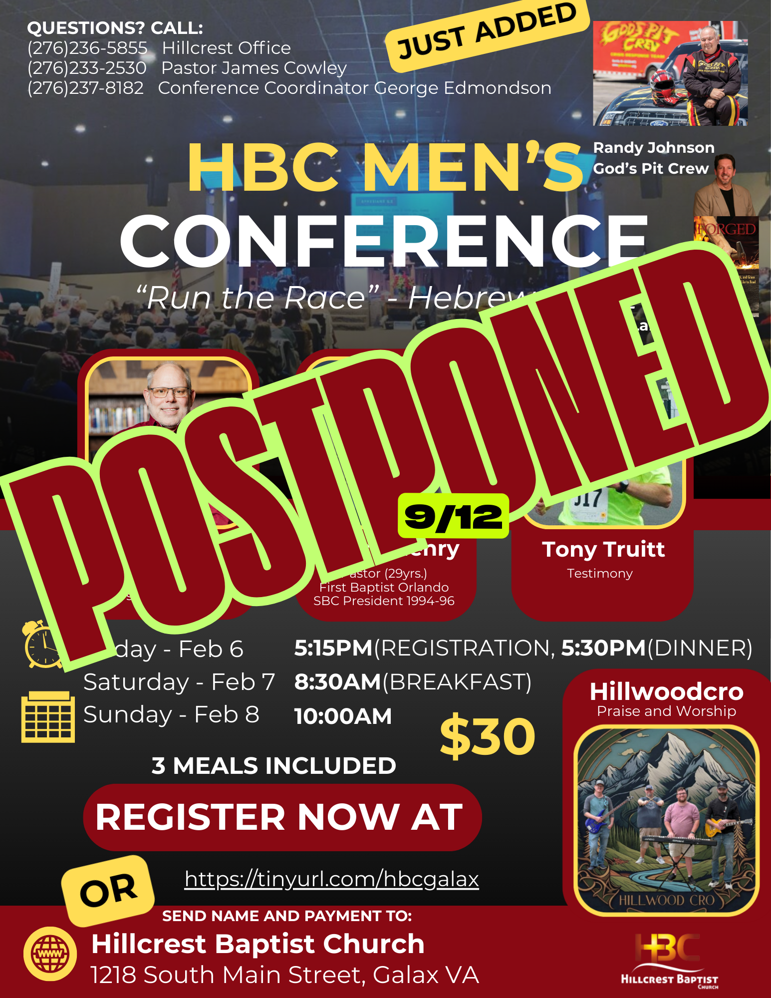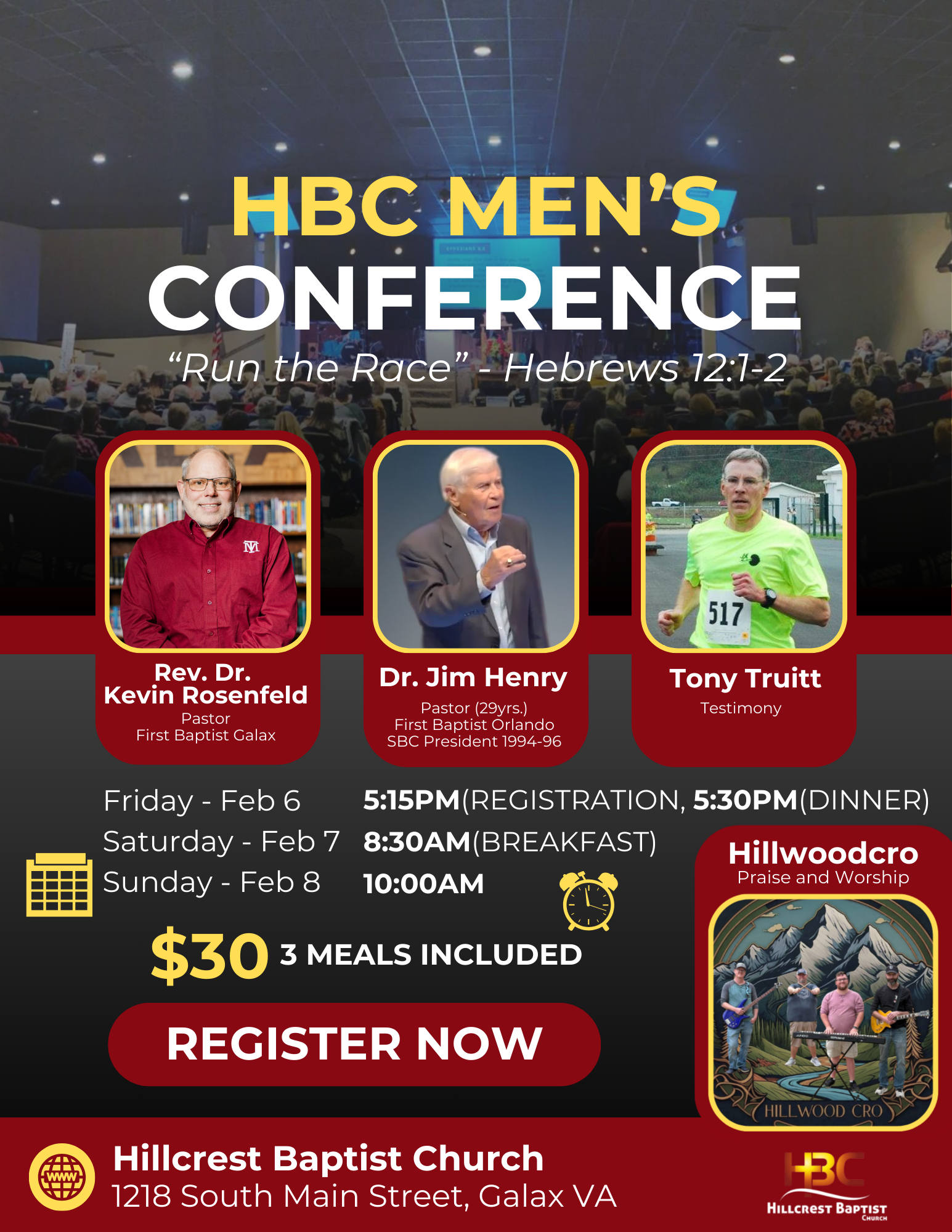 Join us February 6th in Galax, VA to kick off our 2026 Men’s Conference, “Run the Race.” We will provide Friday dinner at 5:30, Saturday breakfast, and Saturday lunch!